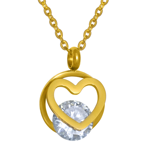 STAINLESS STEEL NECKLACE WITH ROUND PENDANT WITH HEART SHAPE WITH BIG CZ ALL IN IPG COLOR