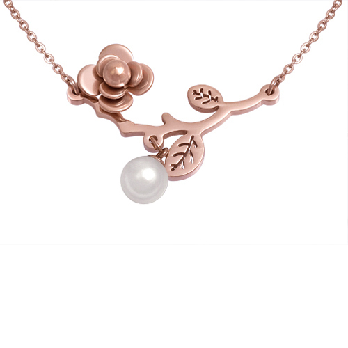 STAINLESS STEEL NECKLACE WITH FLOWER AND LEAVES WITH PEARL CHARM IN IPR COLOR