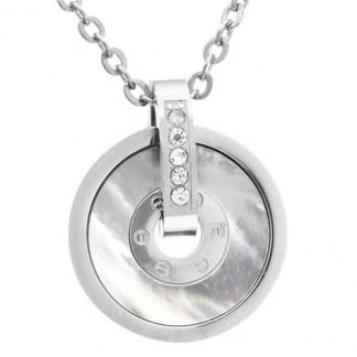 STAINLESS STEEL NECKLACE WITH CIRCLE PENDANT WITH SHELL WITH CZ ALL IN S/S COLOR