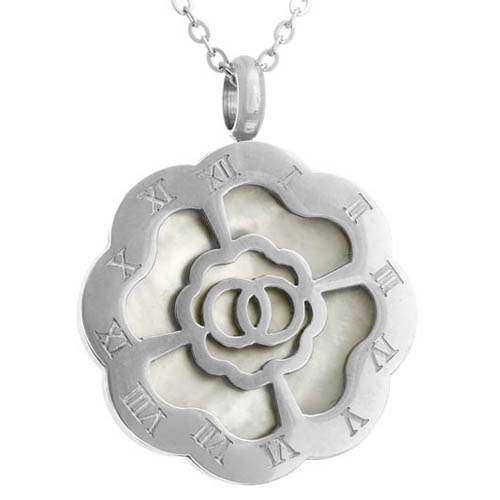 STAINLESS STEEL NECKLACE WITH FLOWER PENDANT WITH ROMAN NUMERALS ALL IN S/S COLOR