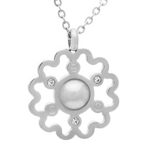 STAINLESS STEEL NECKLACE WITH FLOWER PENDANT WITH PERAL WITH 3 CZ ALL IN S/S COLOR