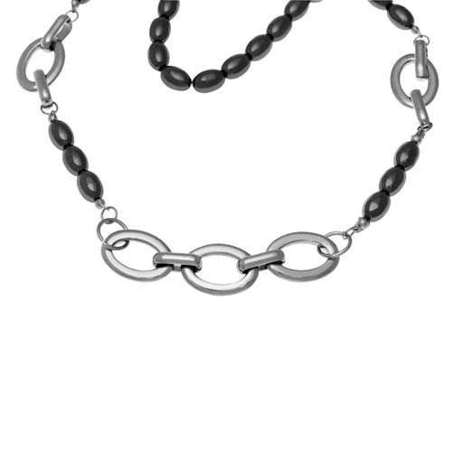 STAINLESS STEEL NECKLACE WITH S/S CHAINS WITH HEMETAIT BLACK OVAL BEADS
