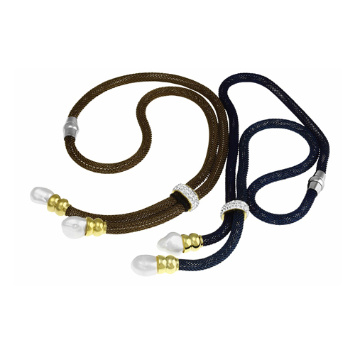 STAINLESS STEEL NECKLACE WITH BROWN OR BLACK CORD WITH PEARLS AND IPG DETAL WITH WHITE CZ AND MAGNET LOCK 2 TONE