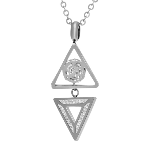 STAINLESS STEEL NECKLACE TWO TRIANGLES WITH A ROSE WITH CZ JOINED TOGETHER WITH A SMALL HOOP ALL IN S/S