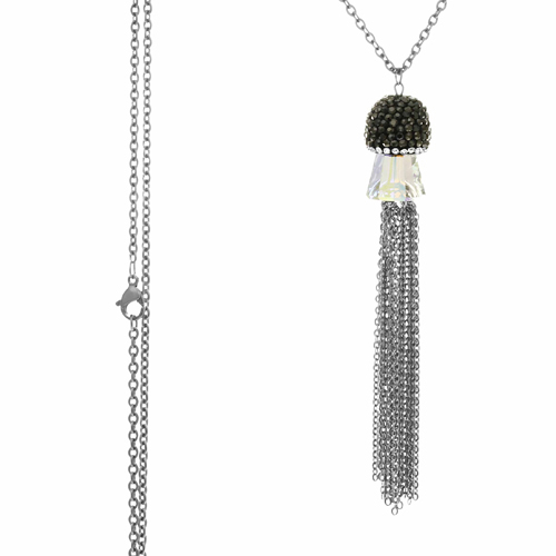 STAINLESS STEEL NECKLACE WITH BLACK & WHITE CZ PENDANT WITH WHITESWAROVSKI CRYSTAL & THIN CHAIN IN CASCADE ALL S/S COLOR