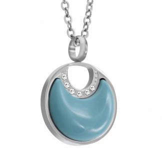 STAINLESS STEEL NECKLACE OPEN CIRCLE SHAPE WITH A DRUM LIKE END WITH CZ IN BLACK BACKGROUND IPG COLOR