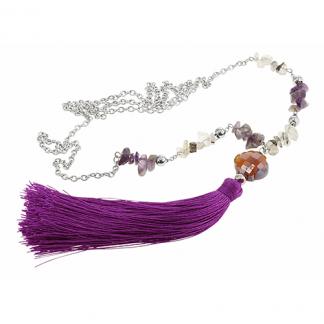STAINLESS STEEL CHAIN WITH IRREGULAR AMATHYST STONE FOLOWER CRYSTAL IN ROSE COLOR/ COTTON TASSEL IN PURPLE COLOR