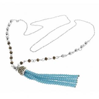 STAINLESS STEEL NECKLACE WITH BLUE TASSEL AND GUN COLOR CRYSTALS