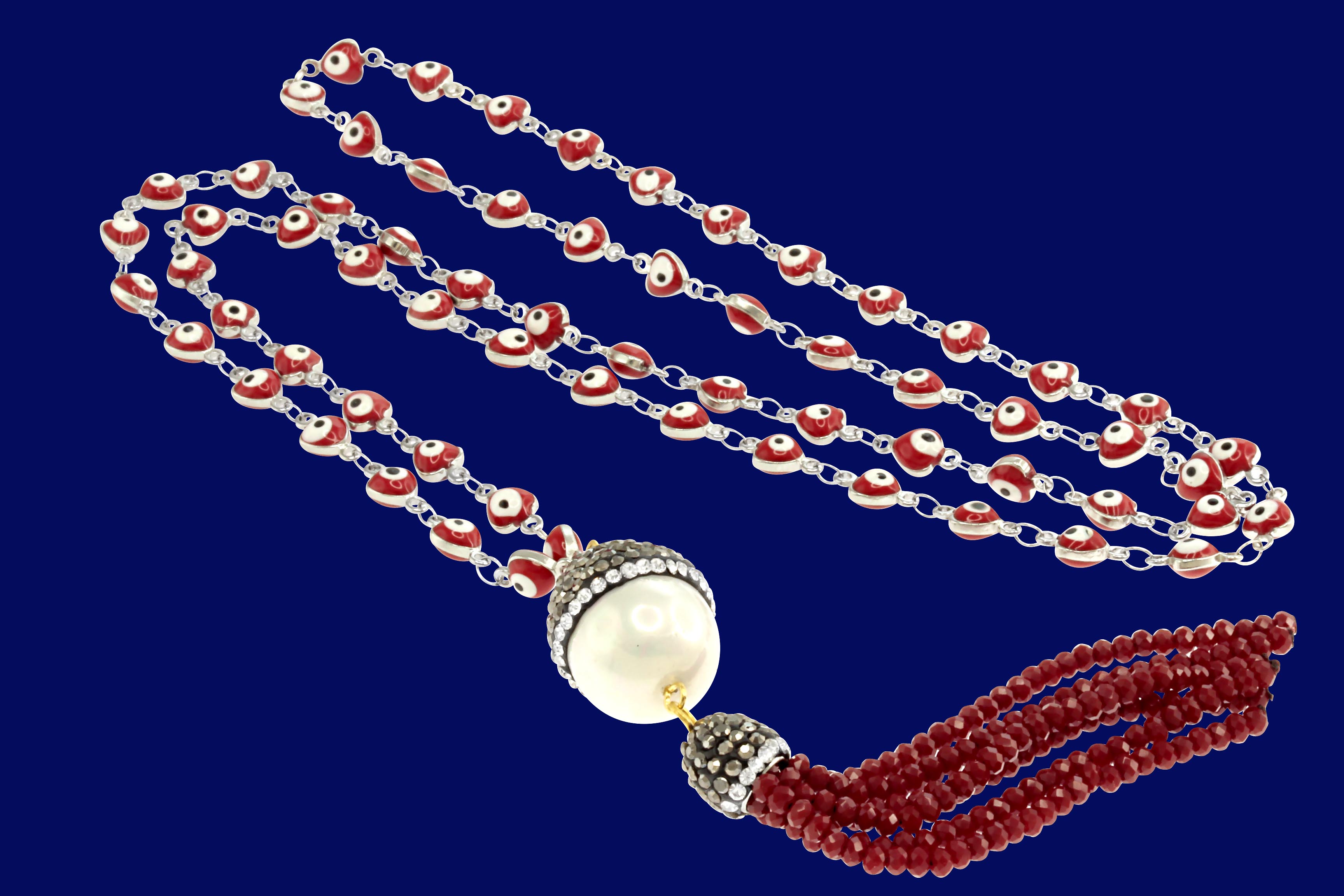 STAINLESS STEEL CHAIN WITH EVEIL EYES & WITH PEARL PENDENT & CRYSTAL TASSEL