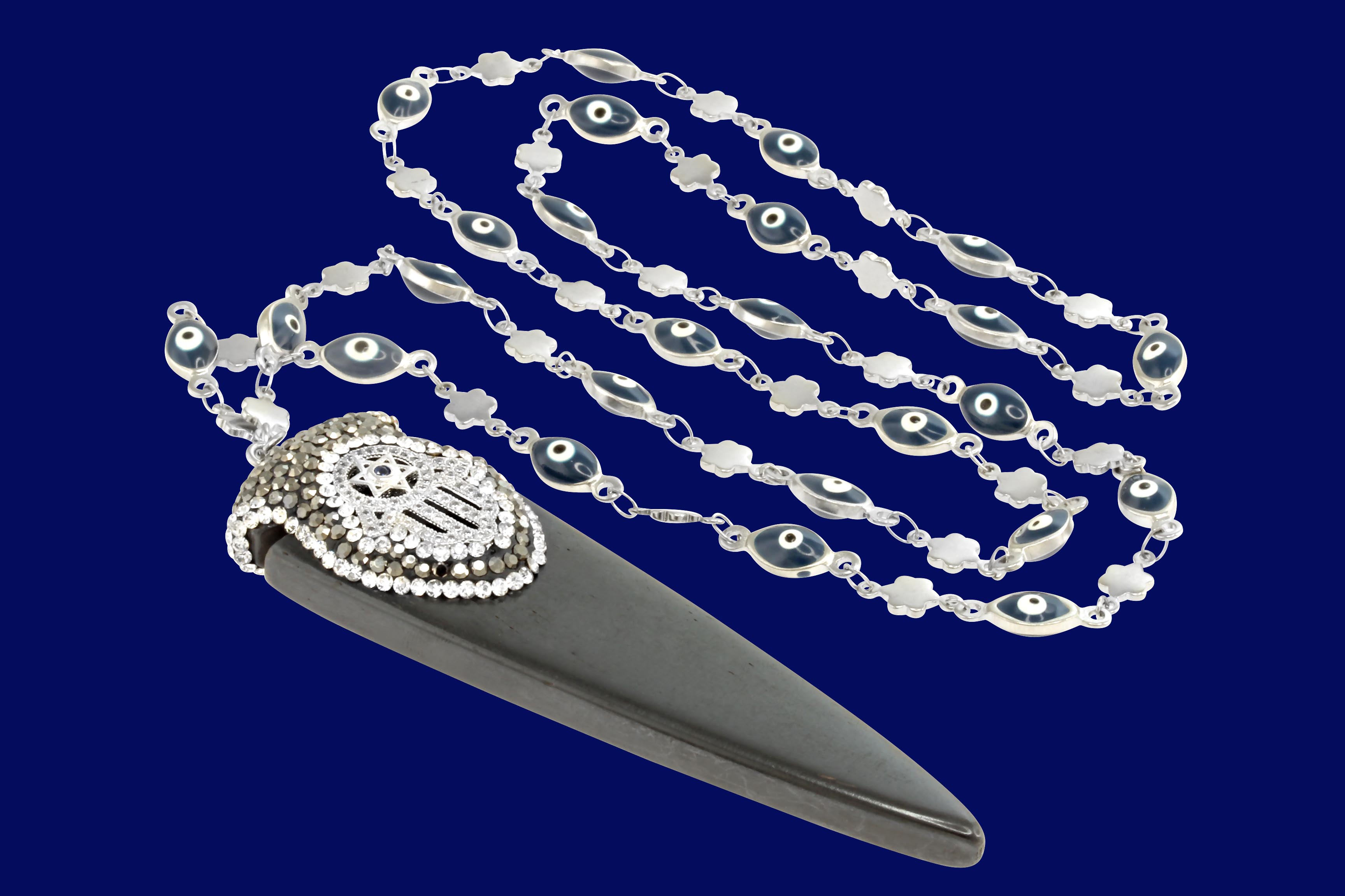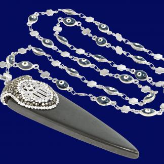 STAINLESS STEEL NECKLACE WITH EVEIL EYES AND ONE WOOD PENDANT WITH BLACK CZ AND HAMSA