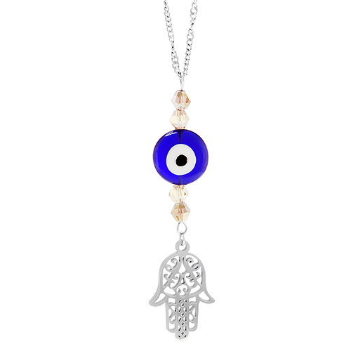 STAINLESS STEEL CHAIN WITH ONE BLUE PLASTIC EYE AND HAMSA & CRYSTAL BEADS
