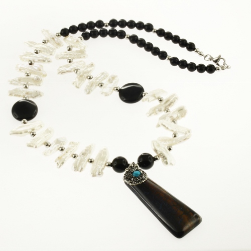 STAINLESS STEEL NECKLACE WITH ONXY STONE AND NATURAL PEARL AND STEEL BALL
