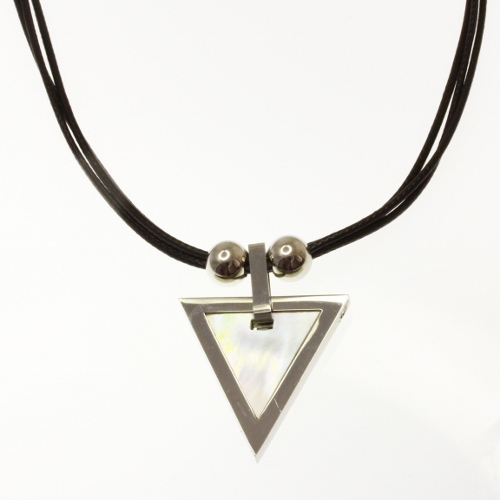 STAINLESS STEEL NECKLACE WITH TRIANGEL SHAPE WITH SHEELL CENTER AND LEATHER ALL IN S/S COLOR