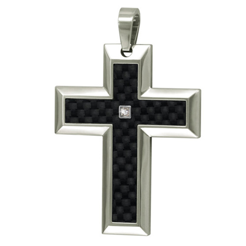 STAINLESS STEEL PENDANT All in Stainless Steel In Cross Shape With Carbon Fiber With CZ