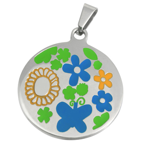 STAINLESS STEEL PENDANT IN CIRCLE SHAPE WITH COLORFUL BUTTERFLY AND FLOWER