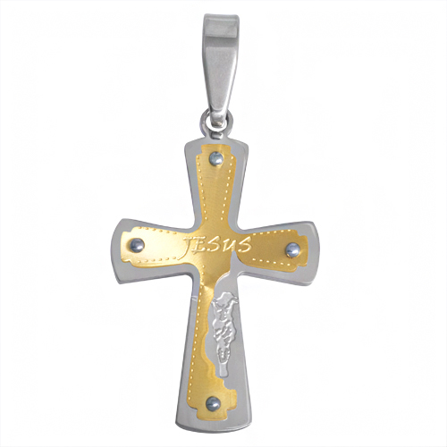 STAINLESS STEEL CROSS PENDANT IN IPG TWO TONE WITH LASER EFFECT WITH 4 PIN AT VERTEX