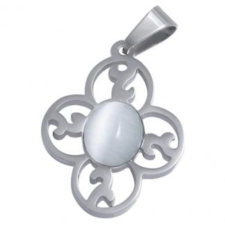 STAINLESS STEEL PENDANT IN FLOWER SHAPE WITH WHITE CAT EYE STONE