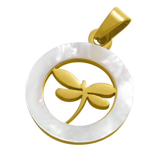 STAINLESS STEEL PENDANT IN ROUND SHAPE WITH SHELL WITH DRAGONFLY ALL IN IPG COLOR