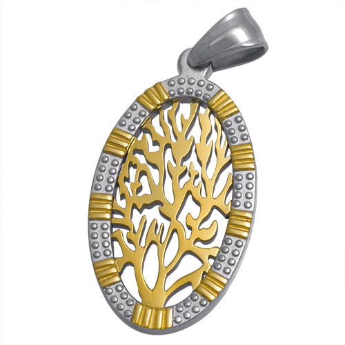 STAINLESS STEEL PENDANT IN OVAL SHAPE WITH CORAL OR TREE PATTERN IN IPG TWO TONE