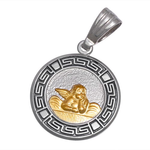 STAINLESS STEEL ROUND PENDANT WITH ANGEL IN IPG TWO TONE