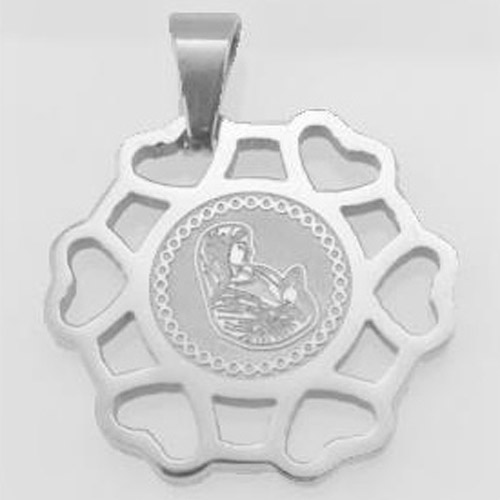STAINLESS STEEL RELIGIOUS PENDANT WITH VIRGIN MARY AND SIX HEART SHAPE AT THE EDGE ALL IN S/S COLOR