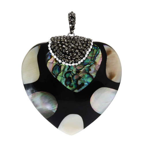 STAINLESS STEEL PENDANT OF SHELL IN HEART SHAPE WITH BLACK AND WHITE CRYSTAL AND BAIL IN S/S