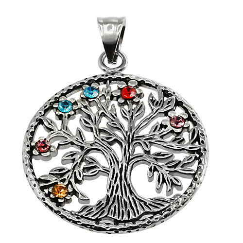 STAINLESS STEEL PENDANT WITH TREE OF LIFE ALL IN SS COLOR WITH RED ?PINK?YELLOW?BLUE STONES
