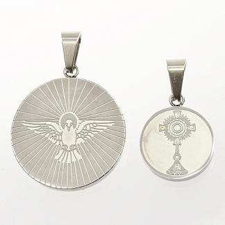 STAINLESS STEEL PENDANT WITH MEDAL IN FRONT AND BIRD IMAGE AT THE BACK