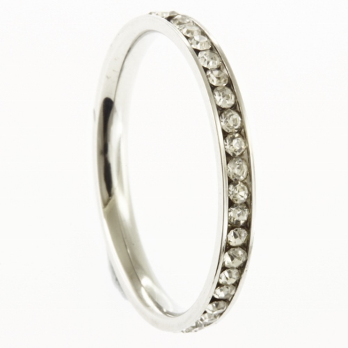STAINLESS STEEL RING WITH ONE LINE OF WHITE CZ IN THE CENTER.