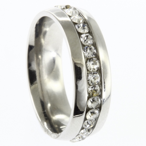 STAINLESS STEEL RING WITH ONE LINE OF WHITE CZ IN THE CENTER.