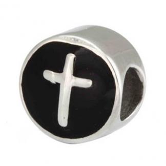 STAINLESS STEEL BEAD IN CIRCLE SHAPE WITH CROSS WITH BLACK ENAMEL ALL IN STEEL COLOR