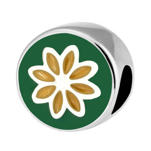 STAINLESS STEEL BEAD IN CIRCLE SHAPE WITH FLOWER PATTERN WITH GREEN AND YELLOW ENAMEL IN STEEL COLOR