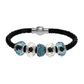 STAINLESS STEEL BRACELET WITH LEATHER & MAGNET LOCK WITH ROUND CZ PENDANT IN CENTER WITH TWO BLUE & TWO WHITE CRYSTAL