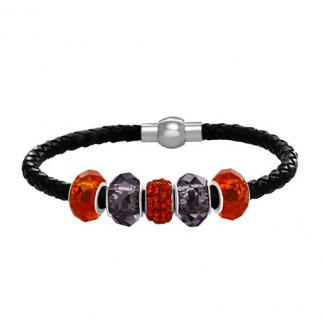 STAINLESS STEEL BRACELET WITH LEATHER & MAGNET LOCK WITH ROUND CZ PENDANT IN CENTER WITH TWO RED & TWO PURPLE CRYSTAL