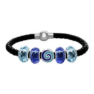STAINLESS STEEL BRACELET WITH LEATHER & MAGNET LOCK WITH ROUND PENDANT WITH BLUE ENAMEL IN CENTER WITH TWO DEEP BLUE & TWO LIGHT BLUE CRYSTAL