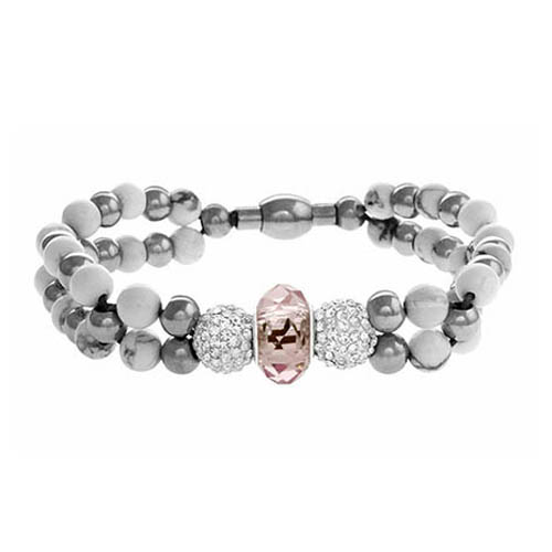 STAINLESS STEEL BRACELET WITH WHITE BEADS & S/S BEADS IN TWO ROW WITH PINK CRYSTAL AND 2 ROUND CZ BALLS
