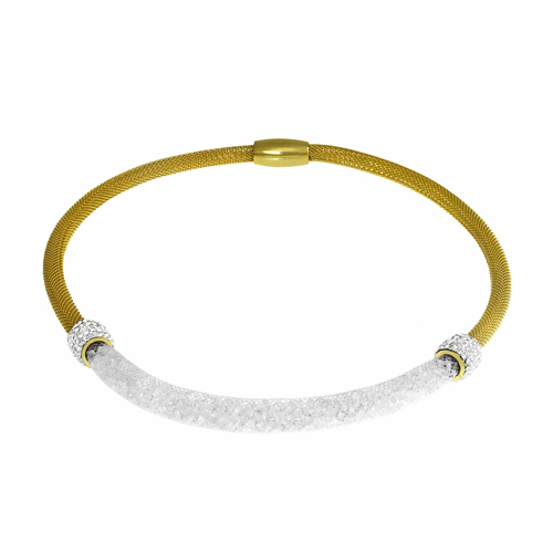 STAINLESS STEEL NECKLACE IPG COLOR CABLE WITH 2 ROUND CHARM WITH WHITE CZ & WHITE CRYSTAL TUBE IN CENTER PIECE