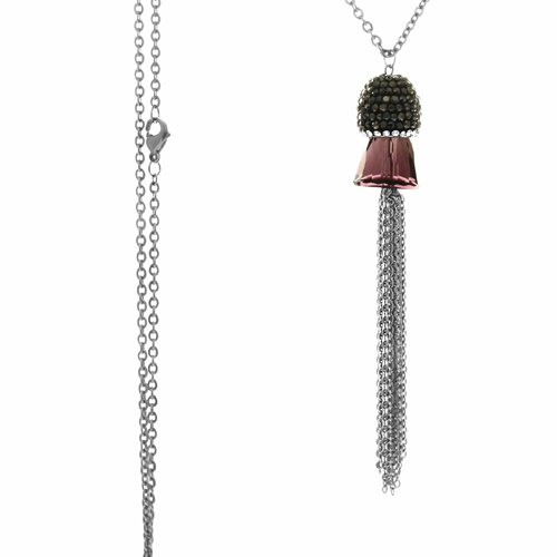 STAINLESS STEEL NECKLACE WITH BLACK & WHITE CZ PENDANT WITH PINK SWAROVSKI CRYSTAL & THIN CHAIN IN CASCADE ALL S/S COLOR