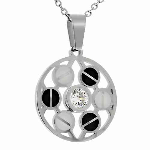 STAINLESS STEEL NECKLACE ALL IN S/S COLOR WITH ROUND SHAPE PENDANT WITH BLACK AND SILVER DETAILS AND A CRYSTAL IN THE MIDDLE