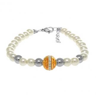 STAINLESS STEEL PEARL BRACELET WITH PEARL COLOR BEADS WITH 4 S/S BEADS WITH ONYX IN ORANGE COLOR IN CIRCLE SHAPE WITH CZ