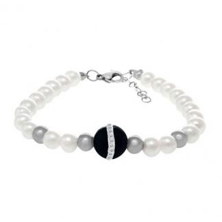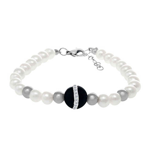 STAINLESS STEEL RIVER PEARL BRACELET WITH RIVER PEARL COLOR BEADS WITH 4 S/S BEADS WITH ONYX IN BLACK COLOR IN CIRCLE SHAPE WITH CZ