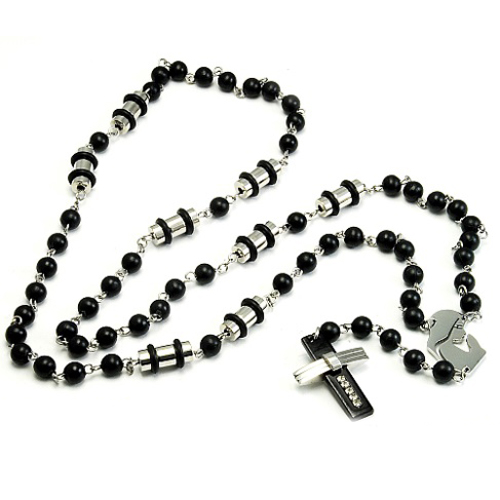 | Stainless Steel Necklace Rosary Chain with black PU balls Mother Mary pendant with the cross Cross in IPB two tone with 5pcs cz |