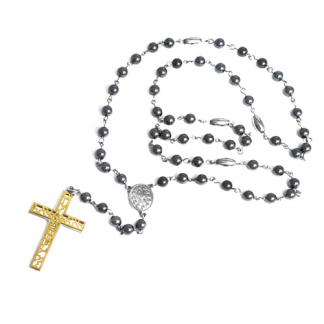 | STAINLESS STEEL ROSARY IN IPG TWO TONE WITH CROSS PENDANT (WITH HEMATITE BEADS) |
