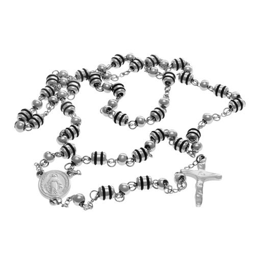 STAINLESS STEEL ROSARY NECKLACE WITH CROSS IN TWO TONE S/S COLOR & BLACK.
