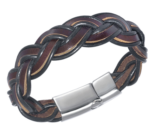STAINLESS STEEL BRACELET WITH BLACK & BROWN LEATHER IN STRAND/ TWIST STYLE WITH MAGNET LOCK