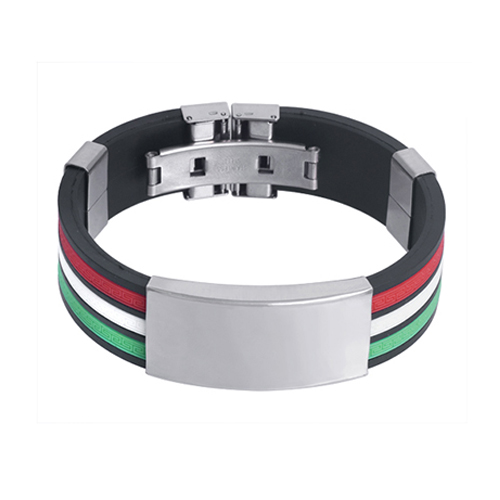 STAINLESS STEEL BRACELET WITH BLACK PU & CENTRE PLATE WITH 3 STRIP PATTERN (IN RED
