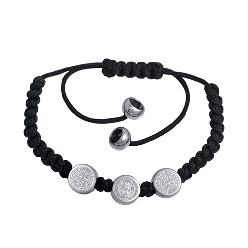 Stainless Steel Bracelet SHAMBALLA BRACELET WITH 3 SAN BENITO IN SMALL SIZE (TWO SIDES DIFFERENT) WITH 2 S/S BEADS AT TWO EXTREME WITH COTTON STRING IN DIFFERENT COLORS (BLACK