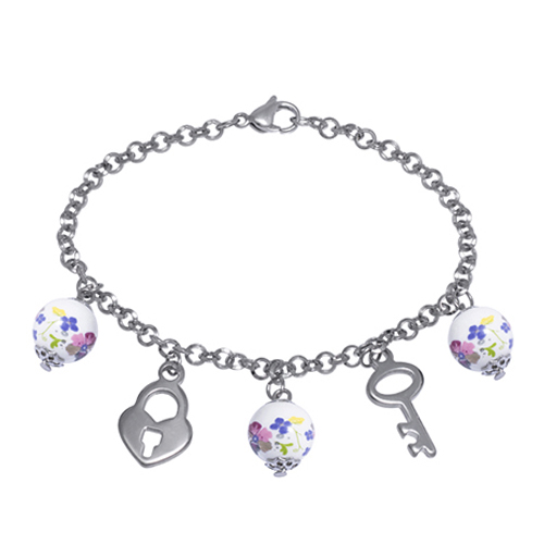 STAINLESS STEEL CHARM BRACELET WITH 3 IMITATION CERAMIC BEAD WITH FLOWER PATTERN WITH 1 KEY & 1 LOCK
